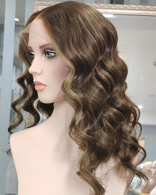 Talia | 20" Brown with Blonde Highlight Body Wave Human Hair Swiss Lace Front Wig - WW034