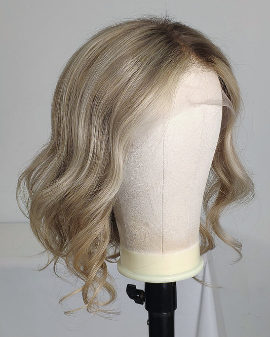Tilda | 14" Rooted Ash Blonde with Soft Platinum Highlights Loose Wavy Human Hair Swiss Lace Front Wig - WW060