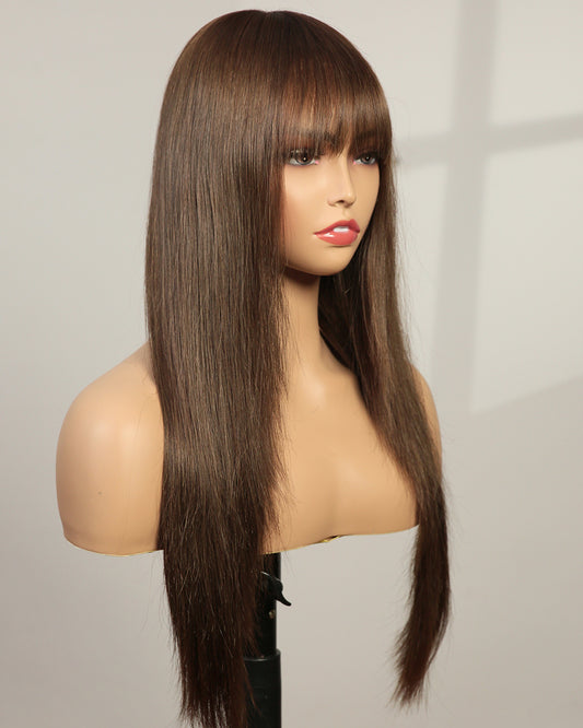 Seren | 20" Soft Light Chestnut Brown Layered Waves with Blunt Bangs Glueless Lace Closure Wig - WW045