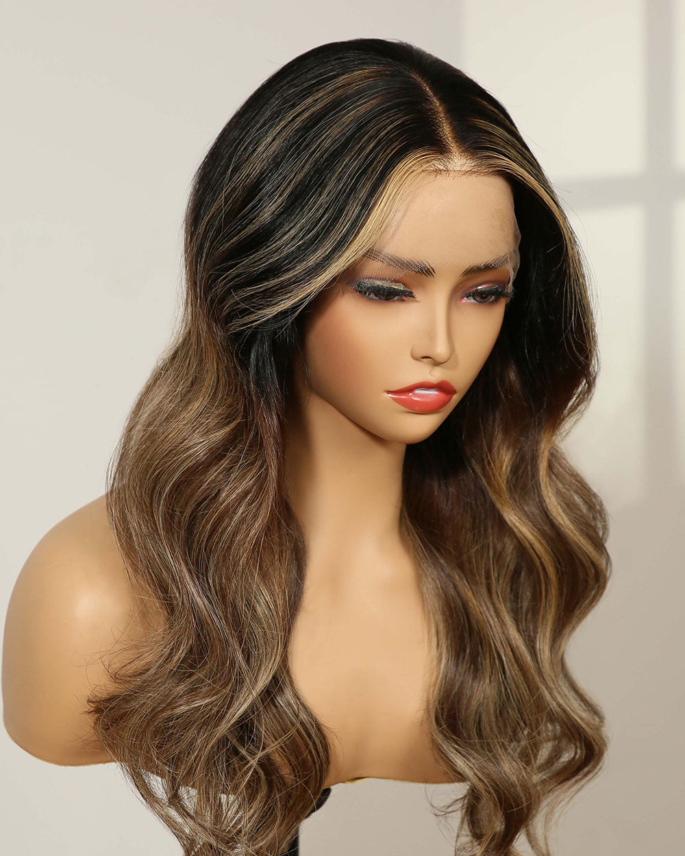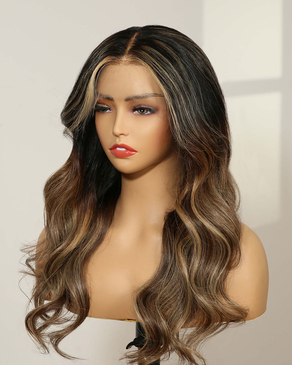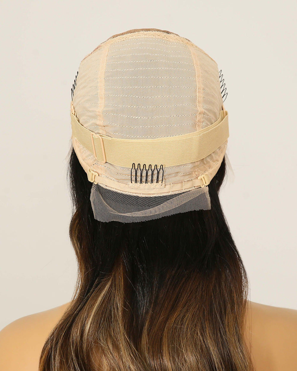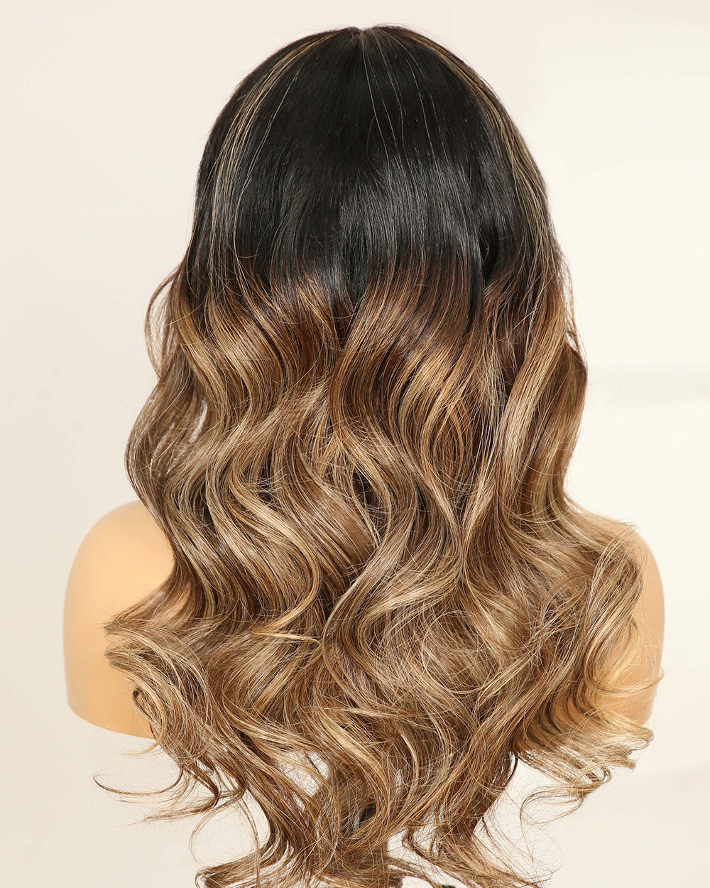 Clearance | 22 Inches Middle Part Wavy Curtain Bangs Dark Brunette Balayage Lace Front Wig - RTW-319