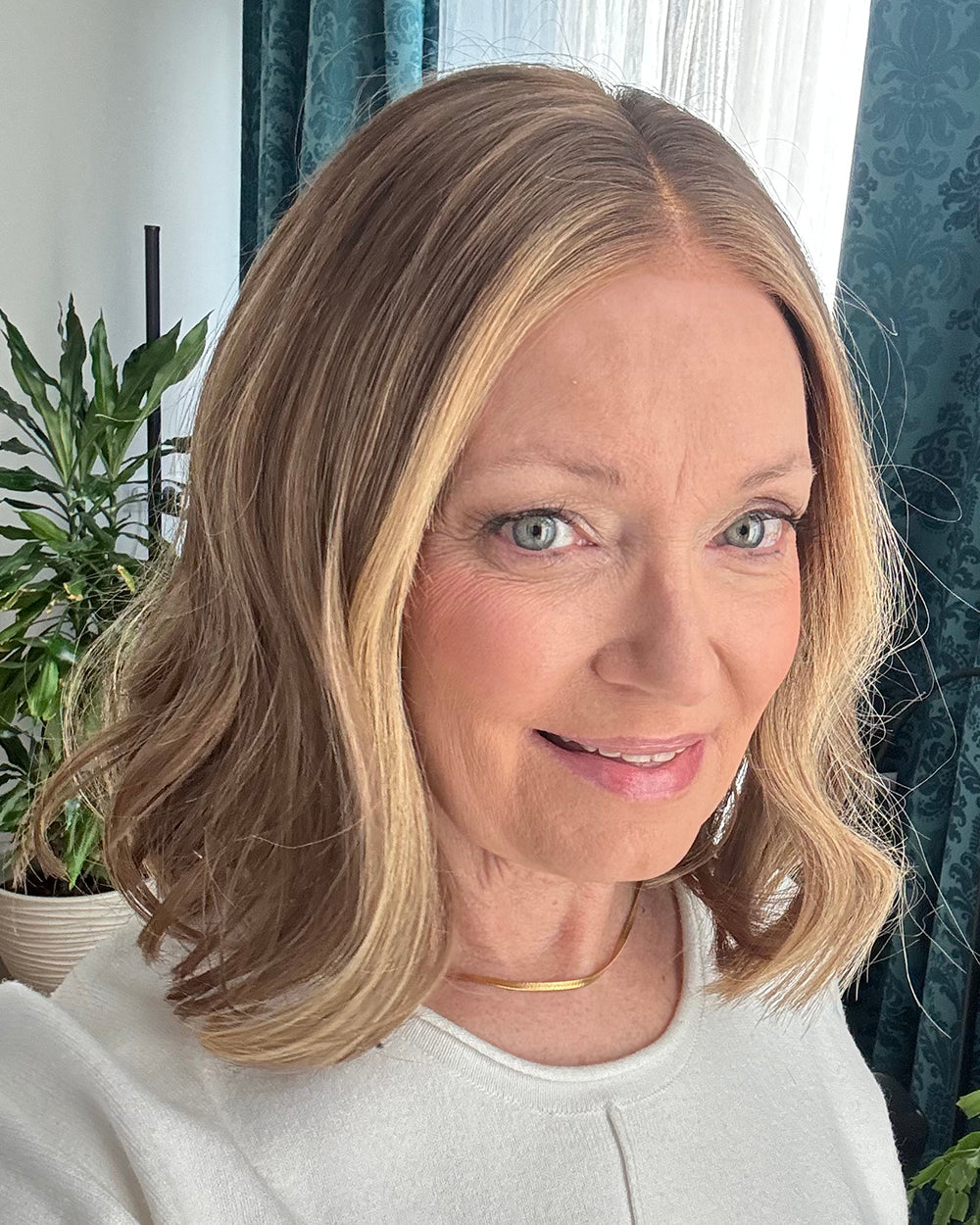 I found this wig in a Facebook wig support group and decided to try it, and I'm honestly impressed. The color looks exactly like the photos-soft brown with these cute blonde highlights that brighten my face. The waves stay in shape and the hair is super soft with zero shedding. I wear it glueless and it stays put, even when I'm out all day. Love it so much!