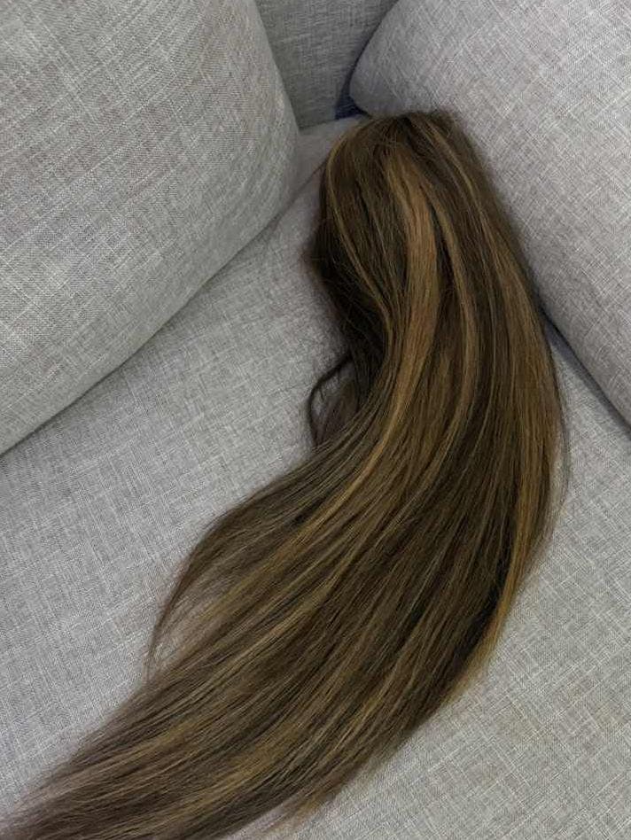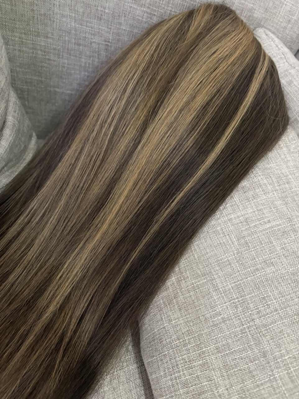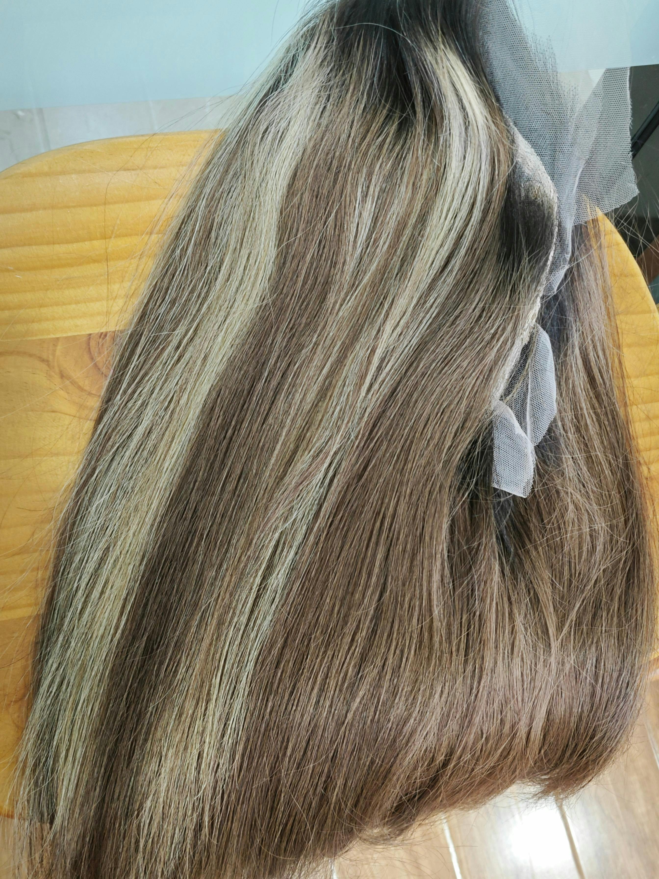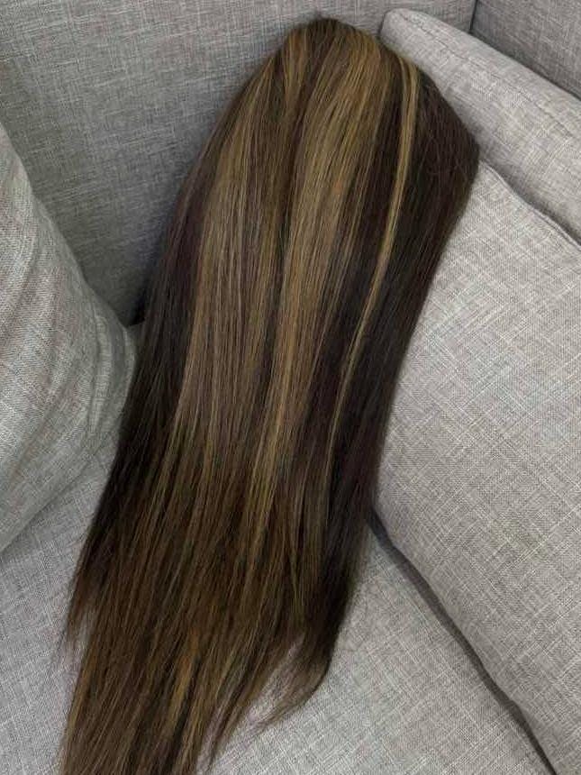 This 16-inch straight wig features a beautiful warm brown base with blonde highlights, made from quality European virgin hair. With a density of 200%, it offers a lightweight and natural look. The 13x6 Swiss lace front allows for versatile parting options, while the transparent lace seamlessly blends into your skin, creating an undetectable and flawless hairline for everyday elegance.